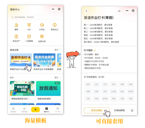 针对寒假作业打卡、学习打卡等高频需求,还能开启循环打卡,一次创建即可完成一寒假的作业收集,开启每日提醒,确保学生按时提交。
