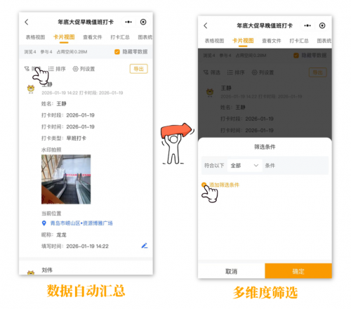 每日巡检记录、员工考勤打卡、值班打卡汇报、营业额统计、货物盘点统计、客户反馈收集…...AI一句话生成专属接龙,各类数据自动汇总统计,信息清晰可查;