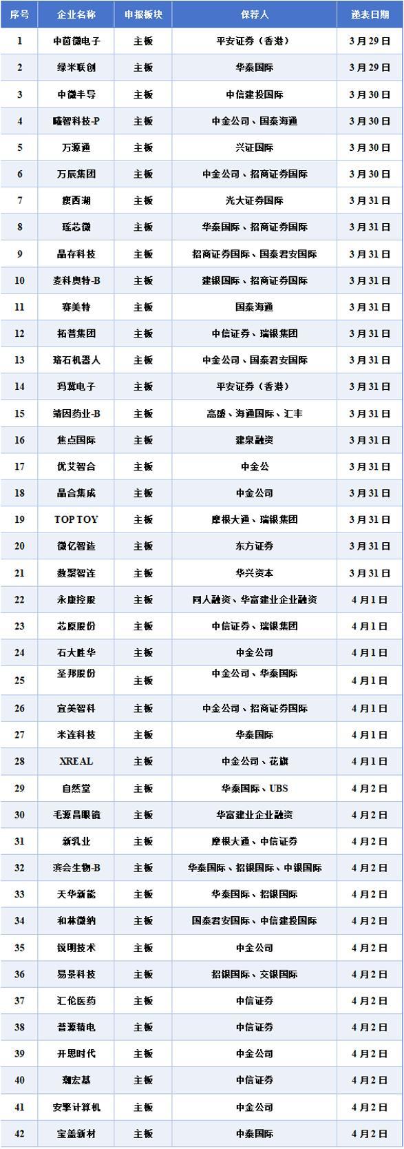 23)、4月1日,芯原股份首次向港交所递交招股书,拟在香港主板上市,联席保荐人为中信证券、瑞银集团。(A+H)