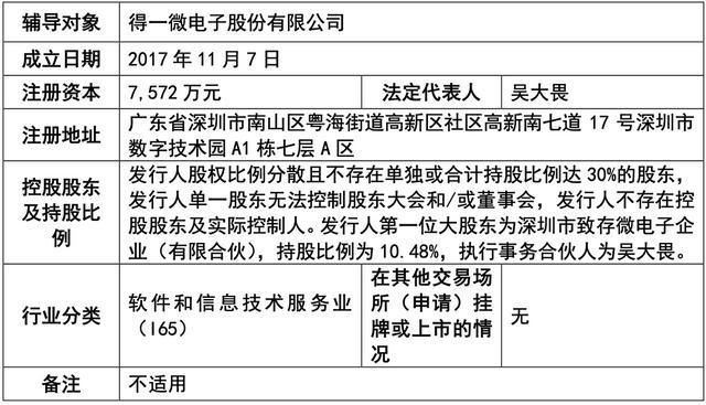 得一微成立于2017年11月,注册资本为7572万元,法定代表人是董事长兼总经理吴大畏,股权比例分散且不存在单独或合计持股比例达30%的股东,不存在控股股东及实际控制人。其第一大股东为深圳市致存微电子企业(有限合伙) ,持股比例为10.48%,执行事务合伙人为吴大畏。