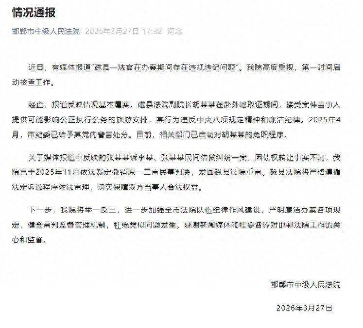 3月27日,邯郸市中级人民法院通报“磁县一法官在办案期间存在违规违纪问题”,全文如下: