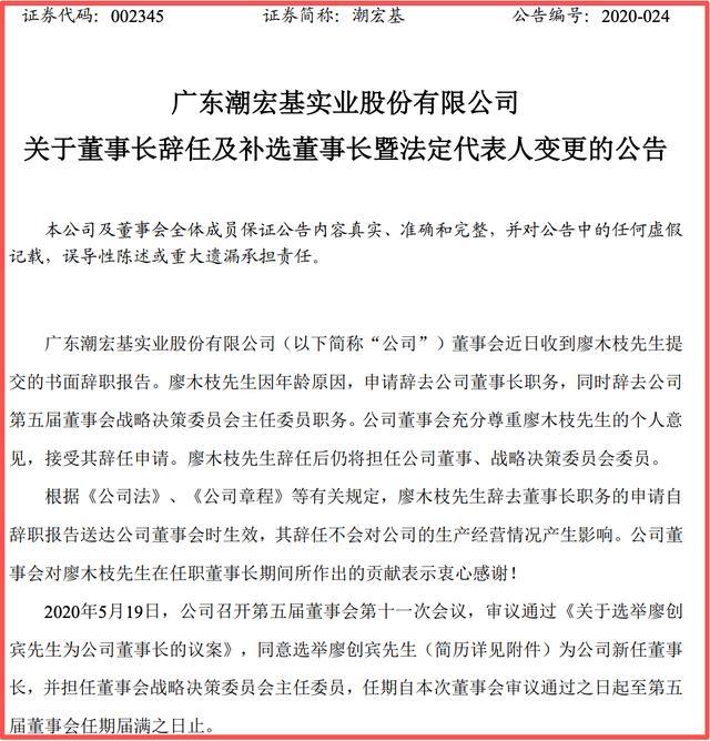 2010年1月,潮宏基在A股上市。彼时,廖木枝为潮宏基实际控制人,并任公司董事长。同时,其儿子廖创宾为公司董事、总经理,女婿林军平为公司董事兼副总经理。直至2020年5月,廖木枝退休离任,由廖创宾接任董事长一职。