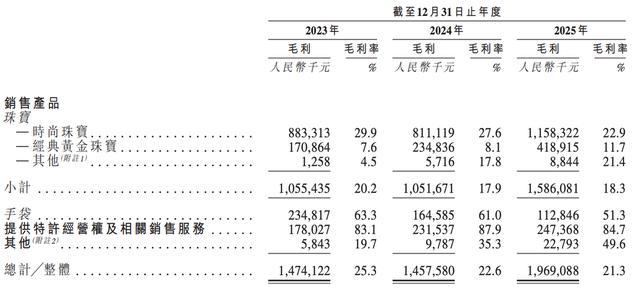 业绩方面,2023年、2024年和2025年,潮宏基的营收分别约为58.36亿元、64.52亿元和92.38亿元,毛利分别约为14.74亿元、14.58亿元和19.69亿元,净利润分别约为3.31亿元、1.69亿元和4.72亿元。