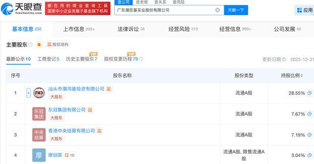 根据公开信息,潮宏基成立于1996年3月,位于广东省汕头市。天眼查App信息显示,潮宏基于2010年1月28日在深圳证券交易所主板上市。目前,该公司的注册资本约8.9亿元,法定代表人为廖创宾,主要股东包括汕头潮宏基投资、东冠集团等。